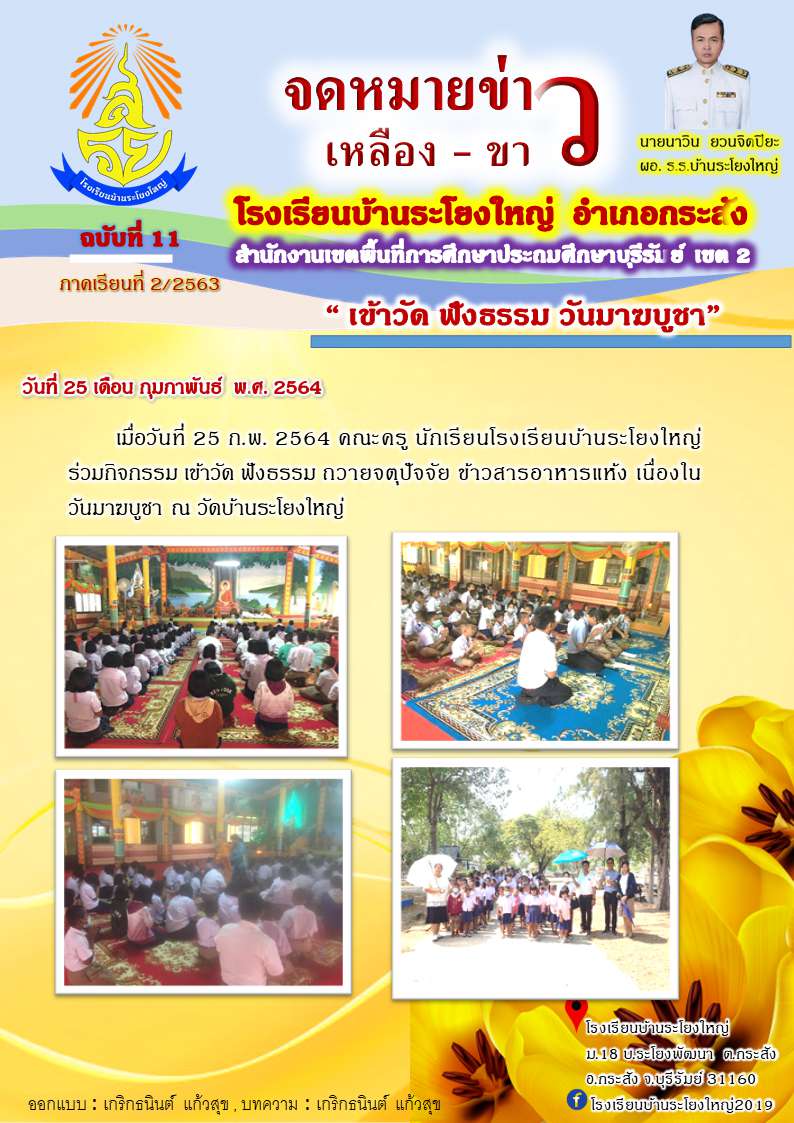 เมื่อวันที่ 25 กุมภาพันธ์ 2564 คณะครู นักเรียน ร่วมกิจกรรม เข้าวัดฟังธรรม ถวายจตุปัจจัย ข้าวสารอาหารแห้ง ในวันมาฆบูชา ณ วัดระโยงใหญ่