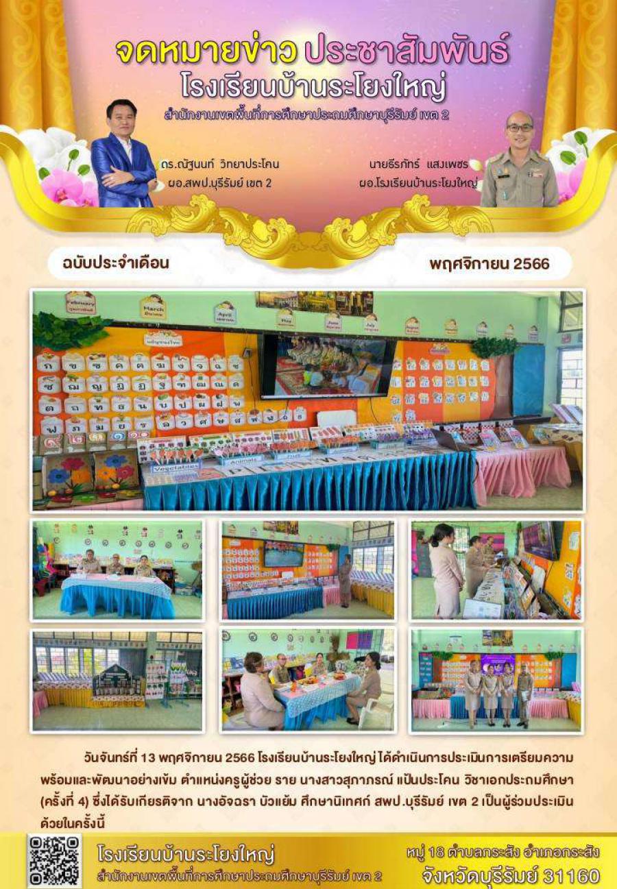 วันจันทร์ที่ 13 พฤศจิกายน 2566 โรงเรียนบ้านระโยงใหญ่ ได้ดำเนินการประเมินการเตรีมความพร้อมและพัฒนาอย่างเข้ม ตำแหน่งครูผู้ช่วย รายนางสาวสุภาภรณ์ แป้นประโคน วิชาเอกประถมศึกษา (ครั้งที่4) ซึ่งได้รับเกียรติจาก นางอัจฉรา บัวแย้ม ศึกษานิเทศก์ สพป.บุรีรัมยื เขต 2 เป็นผู้ร่วมประเมินด้วยในครั้งนี้